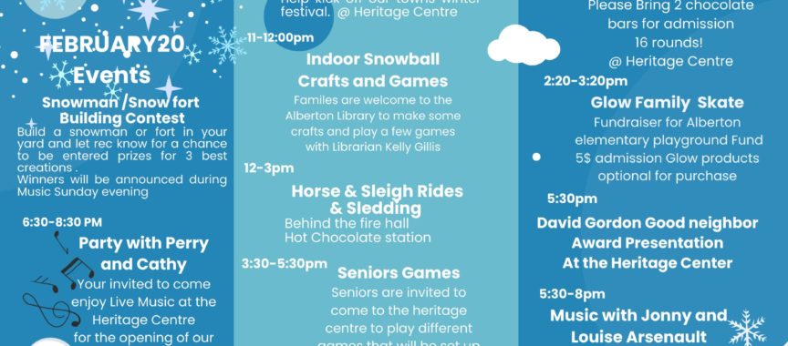 Winter is coming alive in Alberton with the return of the Alberton Winter Carnival, a fun-filled, family-friendly celebration packed with activities for all ages. From February 20–22, residents and visitors are invited to bundle up and enjoy a full weekend of food, music, games, and classic winter experiences right here in town.